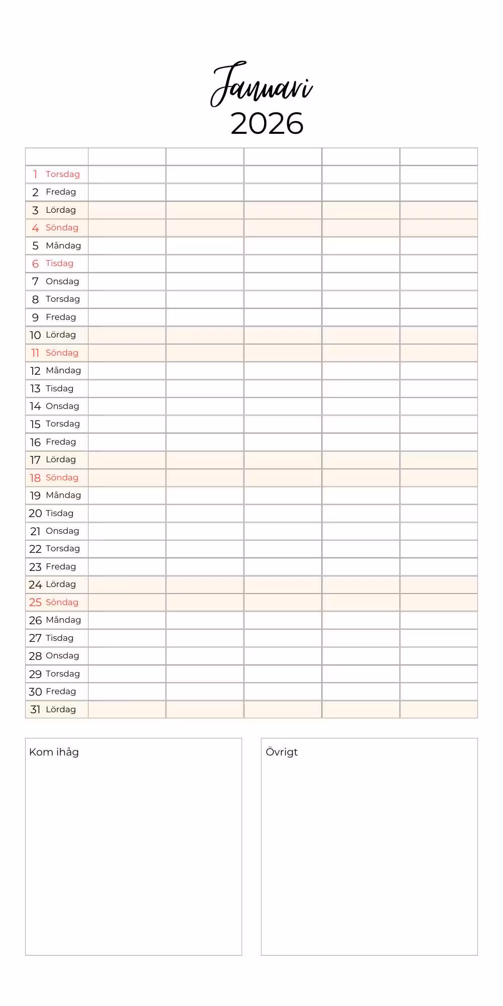 Familjekalender för 2026 – perfekt för upp till 5 familjemedlemmar
